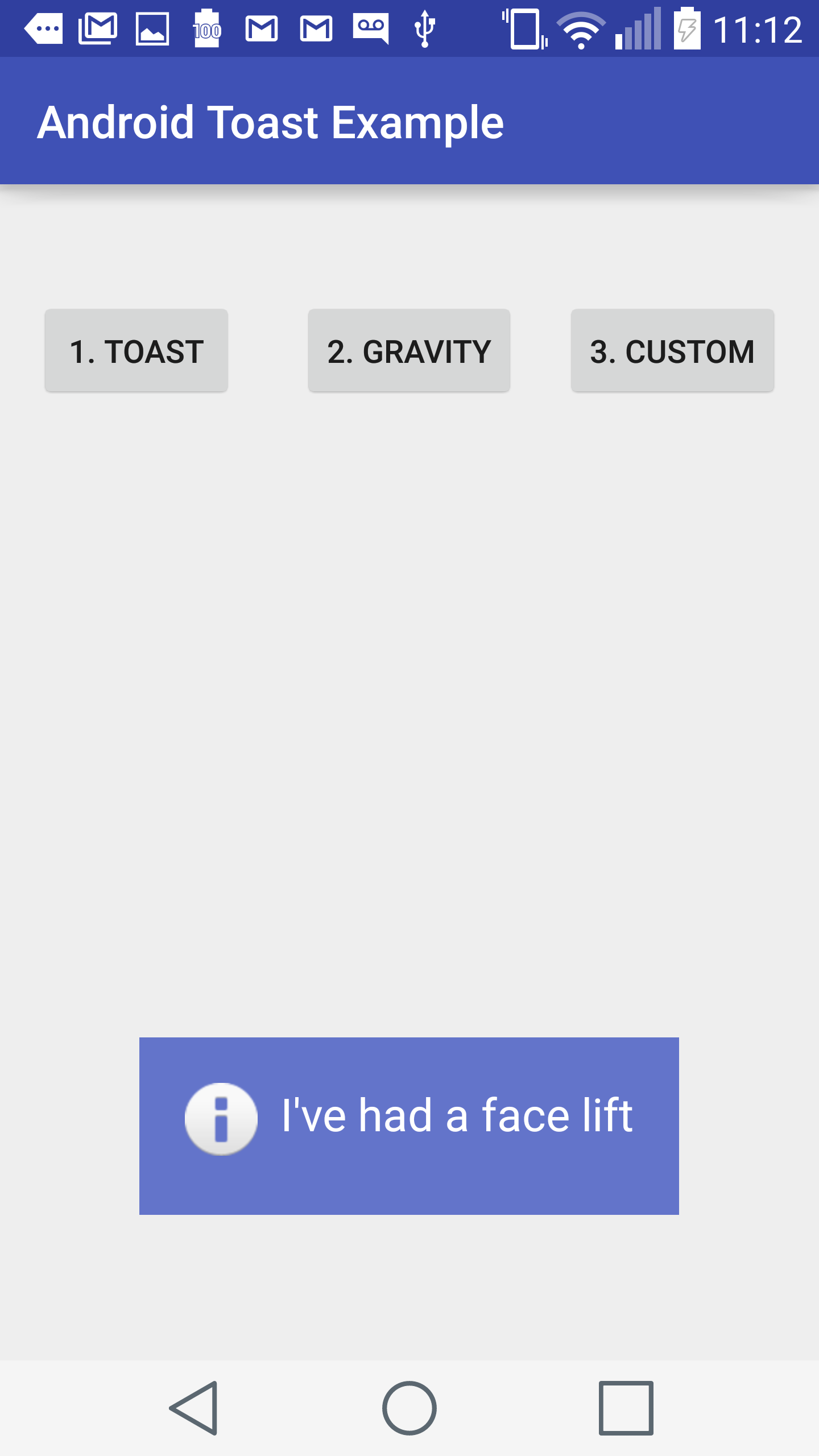 Once executed, you should see the same toast message as shown in fig. 1; which is displayed whenever the Toast button is pressed. A complete listing of the code is provided at the end of this tutorial.